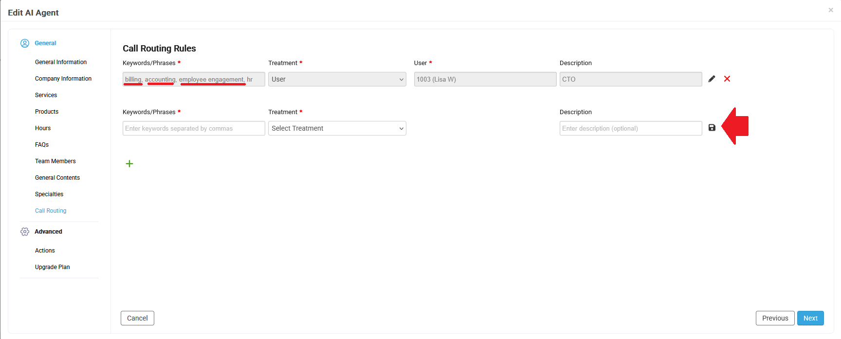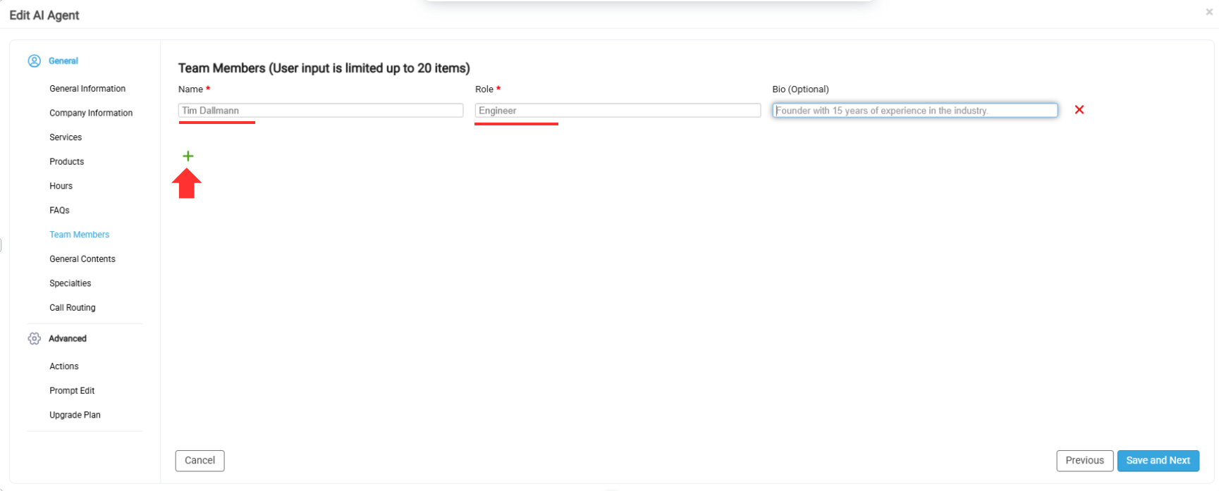 Add team members and their departments so your AI Agent can direct calls appropriately.
