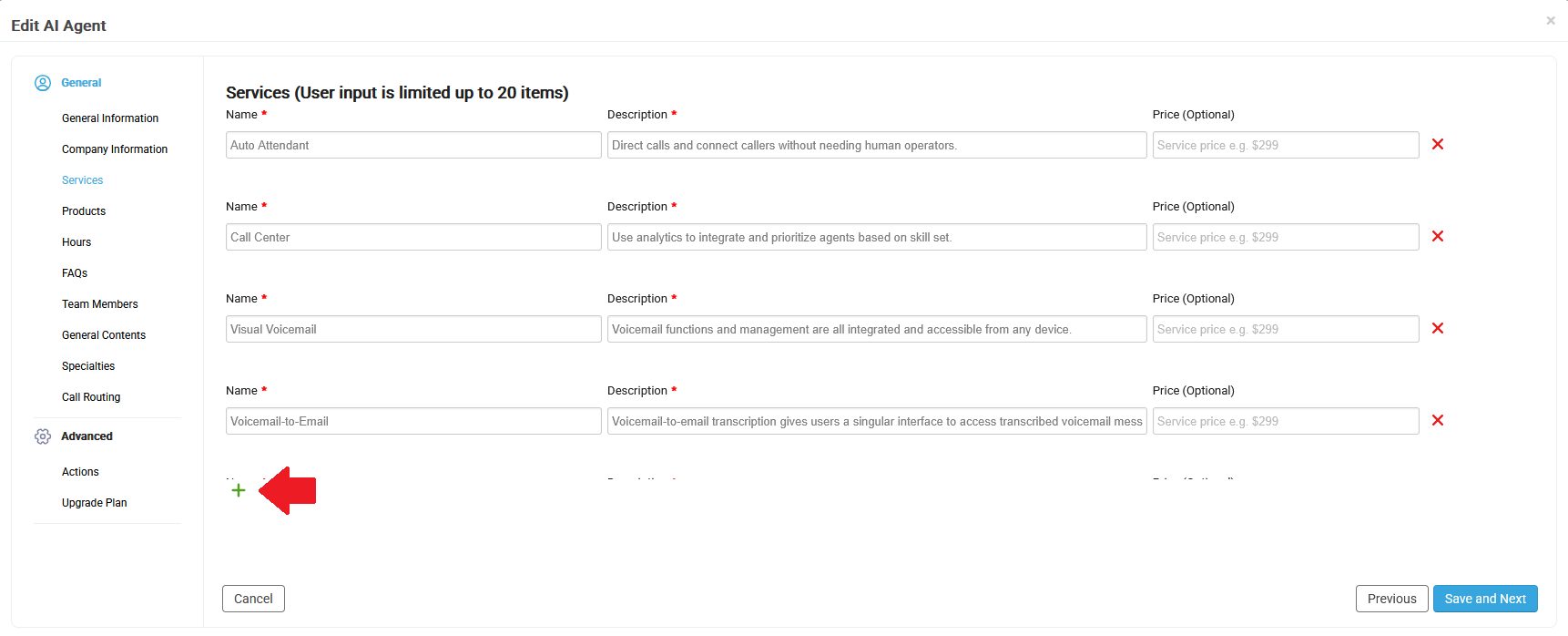 Add up to 20 services and 20 products with descriptions. Your AI Agent will be able to explain your offerings to callers, transfer them to appropriate team members, or provide additional information based on the caller's needs.