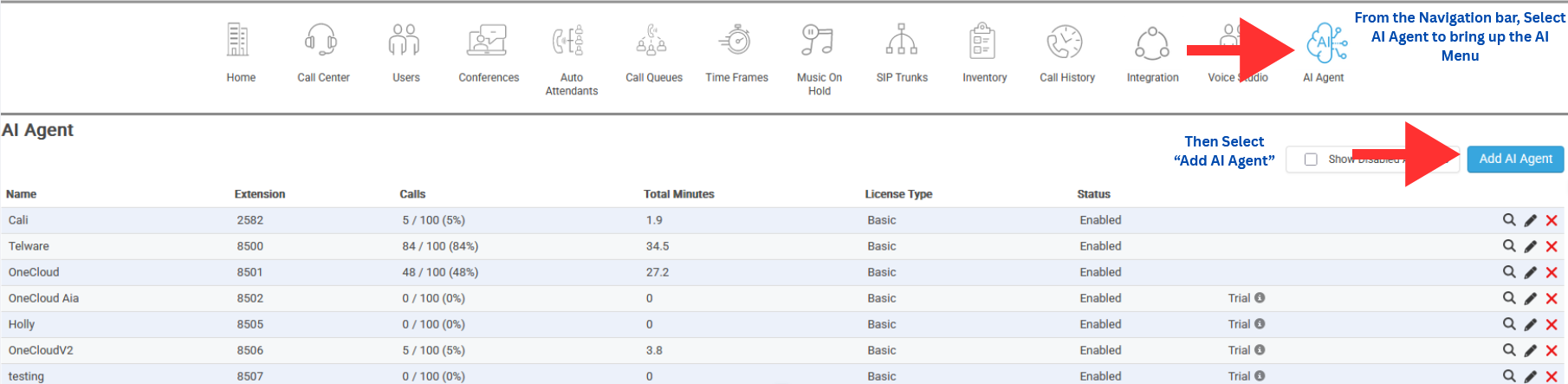 Begin by logging into your account portal, selecting "AI Agent" from the menu, and clicking "Add AI Agent".