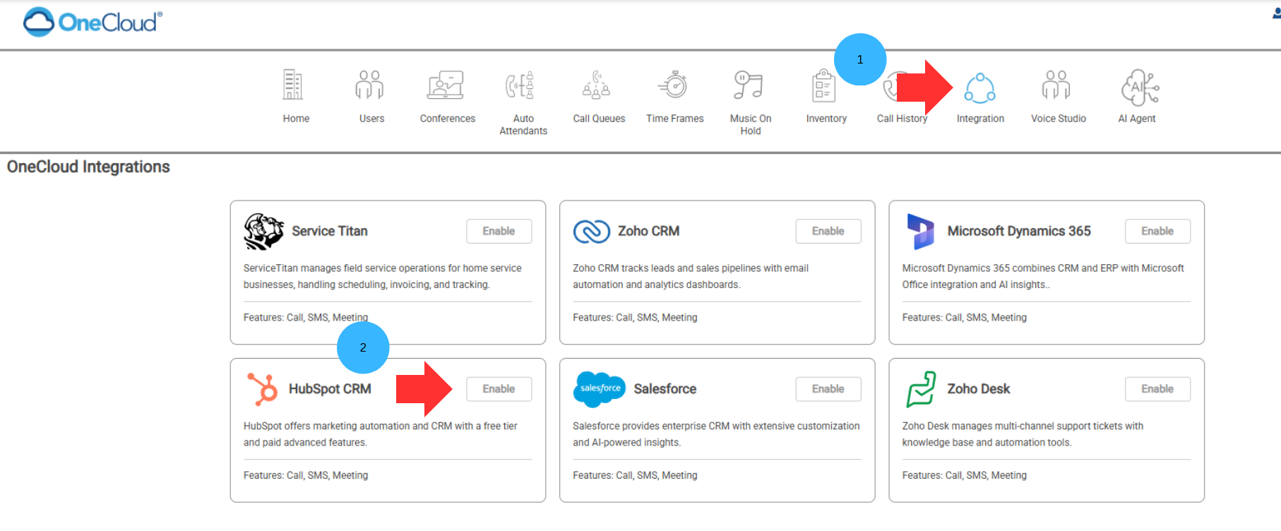 - Click on the "Enable" button on the right side of the HubSpot CRM card (pointed to by red arrow #2)