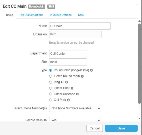 Use the Basic tab to configure core settings for your call queue. These settings help define how your call queue functions and how it's tracked in reports.